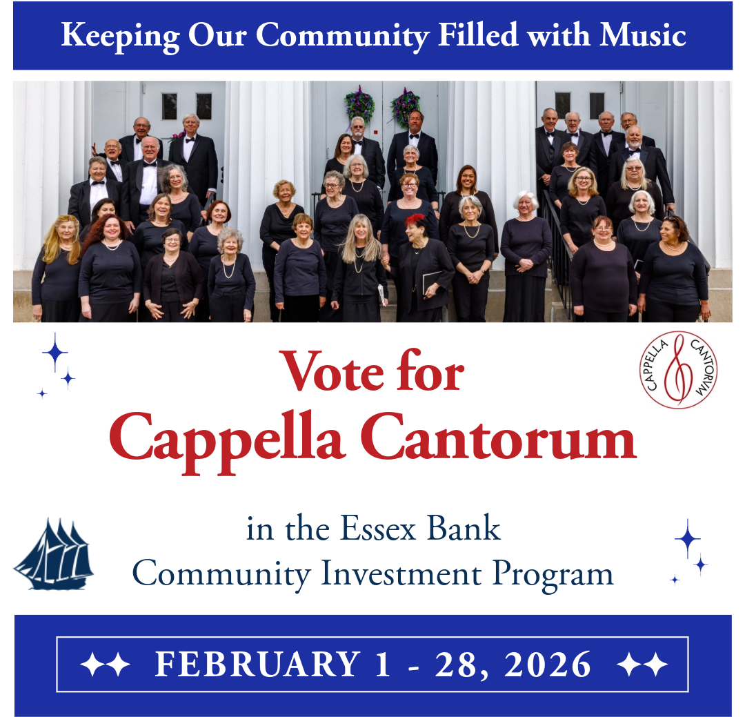 Each year, Essex Bank generously donates 10% of its after-tax income to non-profit organizations in its service area. Cappella Cantorum is honored to be among the non-profits selected in 2026 to receive a portion of these funds based on the number of votes cast by bank customers.