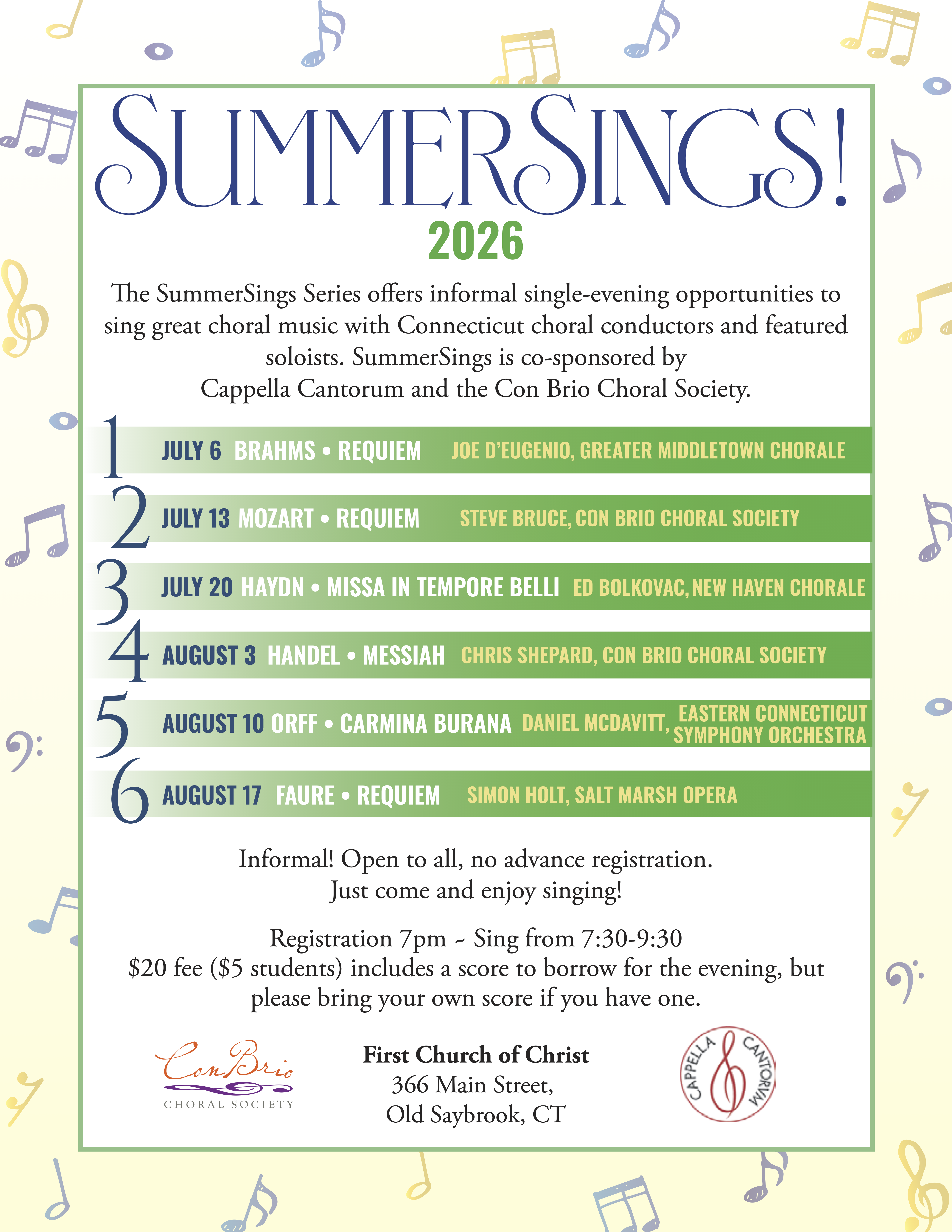 The 2026 SummerSing series will run for six consecutive Mondays from July 6 through August 17. All events will be held at First Church of Christ in Saybrook, 366 Main St, Old Saybrook (see flyer below for full details). We hope you’ll join us!