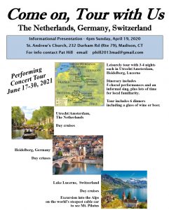Come and join us for an exciting preview of the music that the International Tour Chorus will be performing on its travels through Austria, Germany and Switzerland! The Pre-Tour Concert will take place on Sunday, June 16, 2024 starting at 2pm at St. Andrews Episcopal Church, 232 Durham Road, Madison, CT. Tickets are not required to attend the concert. There is a suggested donation of $10 per person, with all proceeds donated to St. Andrews Episcopal Church. For more information,…